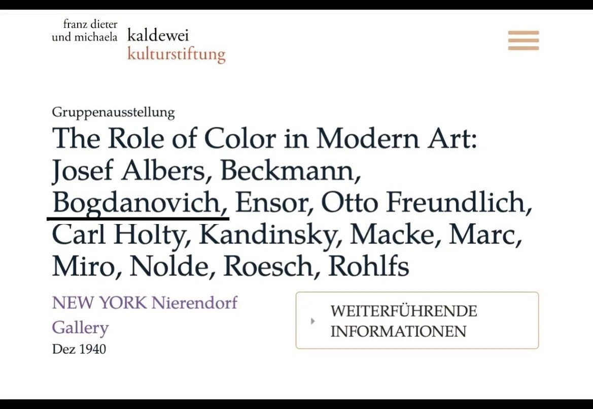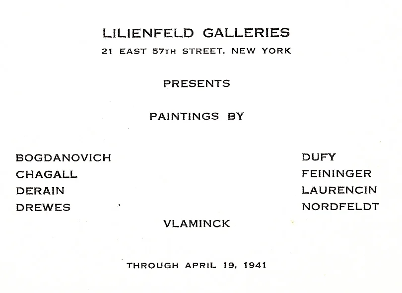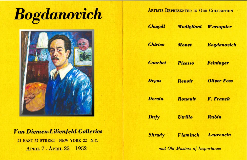Bogdanovich was exhibited in a group show at the prestigious Lilienfeld Galleries in 1941. Followed by a One-man show in 1942; and another Group show, “Ten Gems of Modern Art” in 1943, with Segonzac, Utrillo and Vlaminck.